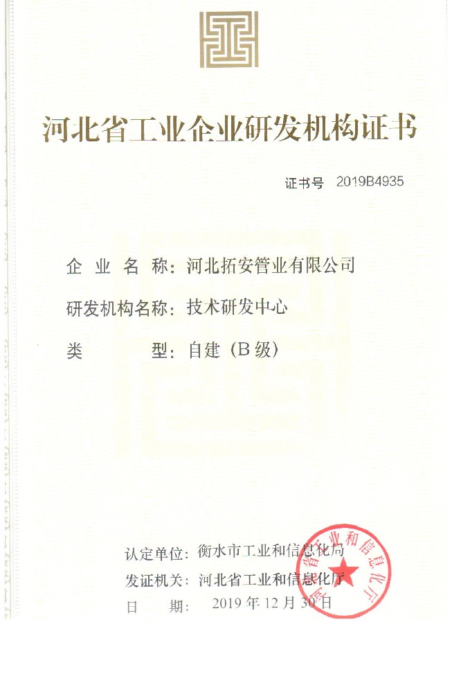 河北省工业企业研发机构证书B
