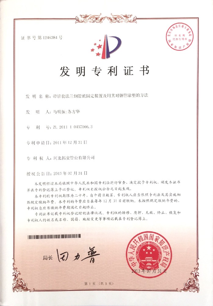 带活套法兰钢管的固定装置及用其对钢管涂塑的方法证书
