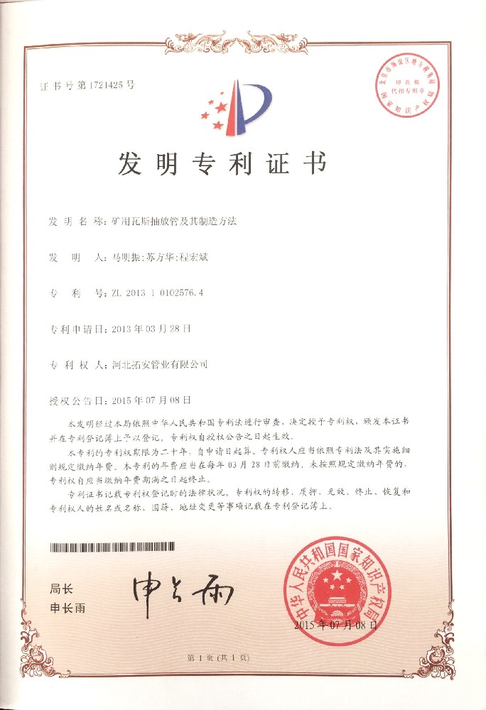 矿用瓦斯抽放管及其制造方法证书