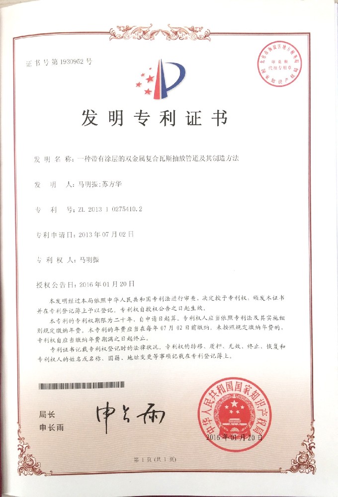 一种带有涂层的双金属复合瓦斯抽放管道及其制造方法证书